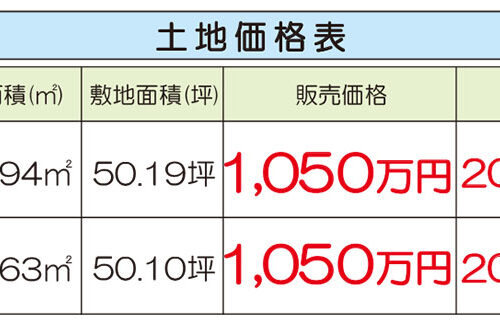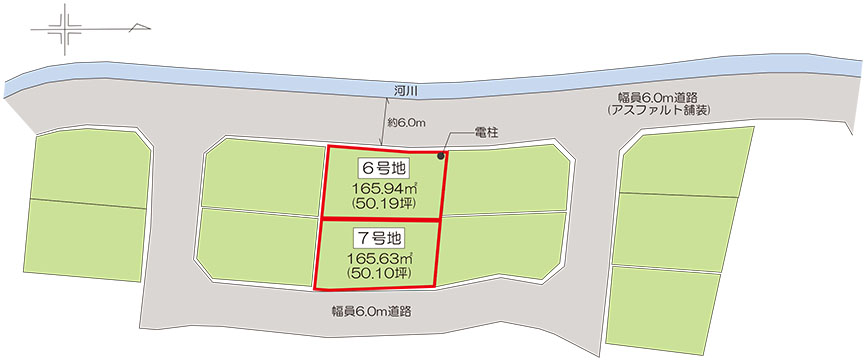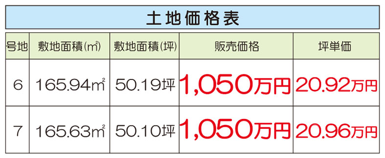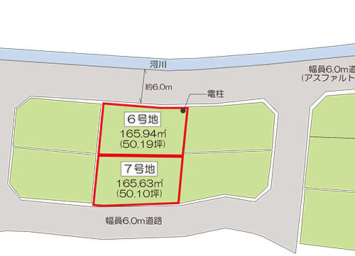 | 特記事項 | 【6号地】165.94㎡(50.19坪)…1,050万円 【7号地】165.63㎡(50.10坪)…1,050万円 上水道加入金(20mm)負担あり(172,900円) 下水道事業受益者負担金負担あり 6号地(54,760円) 7号地(54,701円) 電柱と支線あり(6号地) |