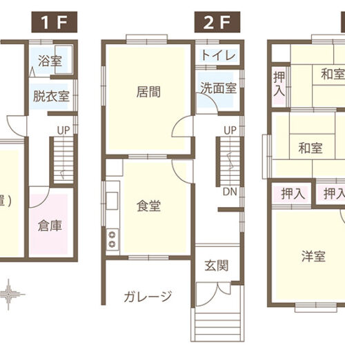 1階は主に収納スペース、3階は寝室等居室となっており、2階を中心として